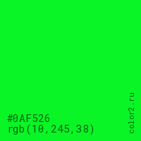 Цвет #0AF526 в цветовой модели RGB обозначается тремя октетами (10, 245, 38) в десятичном формате и #0AF526 в шестнадцатиричном (hex) формате, которые являются интенсивностью красного 10 (hex 0A), интенсивность зелёного 245 (hex F5) и интенсивность синего 38 (hex 26).