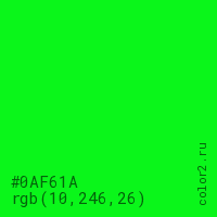 Цвет #0AF61A в цветовой модели RGB обозначается тремя октетами (10, 246, 26) в десятичном формате и #0AF61A в шестнадцатиричном (hex) формате, которые являются интенсивностью красного 10 (hex 0A), интенсивность зелёного 246 (hex F6) и интенсивность синего 26 (hex 1A).