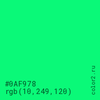 Цвет #0AF978 в цветовой модели RGB обозначается тремя октетами (10, 249, 120) в десятичном формате и #0AF978 в шестнадцатиричном (hex) формате, которые являются интенсивностью красного 10 (hex 0A), интенсивность зелёного 249 (hex F9) и интенсивность синего 120 (hex 78).
