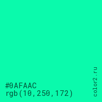 Цвет #0AFAAC в цветовой модели RGB обозначается тремя октетами (10, 250, 172) в десятичном формате и #0AFAAC в шестнадцатиричном (hex) формате, которые являются интенсивностью красного 10 (hex 0A), интенсивность зелёного 250 (hex FA) и интенсивность синего 172 (hex AC).