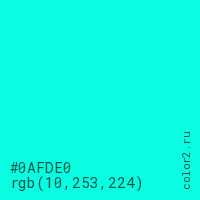 Цвет #0AFDE0 в цветовой модели RGB обозначается тремя октетами (10, 253, 224) в десятичном формате и #0AFDE0 в шестнадцатиричном (hex) формате, которые являются интенсивностью красного 10 (hex 0A), интенсивность зелёного 253 (hex FD) и интенсивность синего 224 (hex E0).
