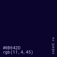 Цвет #0B042D в цветовой модели RGB обозначается тремя октетами (11, 4, 45) в десятичном формате и #0B042D в шестнадцатиричном (hex) формате, которые являются интенсивностью красного 11 (hex 0B), интенсивность зелёного 4 (hex 04) и интенсивность синего 45 (hex 2D).