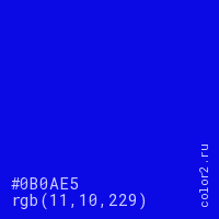 Цвет #0B0AE5 в цветовой модели RGB обозначается тремя октетами (11, 10, 229) в десятичном формате и #0B0AE5 в шестнадцатиричном (hex) формате, которые являются интенсивностью красного 11 (hex 0B), интенсивность зелёного 10 (hex 0A) и интенсивность синего 229 (hex E5).