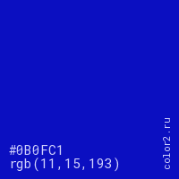 Цвет #0B0FC1 в цветовой модели RGB обозначается тремя октетами (11, 15, 193) в десятичном формате и #0B0FC1 в шестнадцатиричном (hex) формате, которые являются интенсивностью красного 11 (hex 0B), интенсивность зелёного 15 (hex 0F) и интенсивность синего 193 (hex C1).