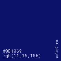 Цвет #0B1069 в цветовой модели RGB обозначается тремя октетами (11, 16, 105) в десятичном формате и #0B1069 в шестнадцатиричном (hex) формате, которые являются интенсивностью красного 11 (hex 0B), интенсивность зелёного 16 (hex 10) и интенсивность синего 105 (hex 69).