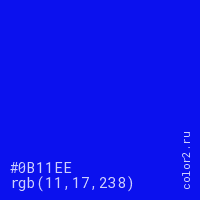 Цвет #0B11EE в цветовой модели RGB обозначается тремя октетами (11, 17, 238) в десятичном формате и #0B11EE в шестнадцатиричном (hex) формате, которые являются интенсивностью красного 11 (hex 0B), интенсивность зелёного 17 (hex 11) и интенсивность синего 238 (hex EE).