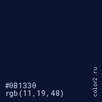 Цвет #0B1330 в цветовой модели RGB обозначается тремя октетами (11, 19, 48) в десятичном формате и #0B1330 в шестнадцатиричном (hex) формате, которые являются интенсивностью красного 11 (hex 0B), интенсивность зелёного 19 (hex 13) и интенсивность синего 48 (hex 30).