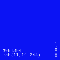 Цвет #0B13F4 в цветовой модели RGB обозначается тремя октетами (11, 19, 244) в десятичном формате и #0B13F4 в шестнадцатиричном (hex) формате, которые являются интенсивностью красного 11 (hex 0B), интенсивность зелёного 19 (hex 13) и интенсивность синего 244 (hex F4).