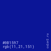 Цвет #0B1597 в цветовой модели RGB обозначается тремя октетами (11, 21, 151) в десятичном формате и #0B1597 в шестнадцатиричном (hex) формате, которые являются интенсивностью красного 11 (hex 0B), интенсивность зелёного 21 (hex 15) и интенсивность синего 151 (hex 97).