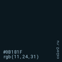 Цвет #0B181F в цветовой модели RGB обозначается тремя октетами (11, 24, 31) в десятичном формате и #0B181F в шестнадцатиричном (hex) формате, которые являются интенсивностью красного 11 (hex 0B), интенсивность зелёного 24 (hex 18) и интенсивность синего 31 (hex 1F).