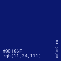 Цвет #0B186F в цветовой модели RGB обозначается тремя октетами (11, 24, 111) в десятичном формате и #0B186F в шестнадцатиричном (hex) формате, которые являются интенсивностью красного 11 (hex 0B), интенсивность зелёного 24 (hex 18) и интенсивность синего 111 (hex 6F).