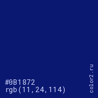 Цвет #0B1872 в цветовой модели RGB обозначается тремя октетами (11, 24, 114) в десятичном формате и #0B1872 в шестнадцатиричном (hex) формате, которые являются интенсивностью красного 11 (hex 0B), интенсивность зелёного 24 (hex 18) и интенсивность синего 114 (hex 72).