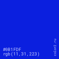Цвет #0B1FDF в цветовой модели RGB обозначается тремя октетами (11, 31, 223) в десятичном формате и #0B1FDF в шестнадцатиричном (hex) формате, которые являются интенсивностью красного 11 (hex 0B), интенсивность зелёного 31 (hex 1F) и интенсивность синего 223 (hex DF).