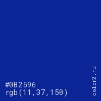 Цвет #0B2596 в цветовой модели RGB обозначается тремя октетами (11, 37, 150) в десятичном формате и #0B2596 в шестнадцатиричном (hex) формате, которые являются интенсивностью красного 11 (hex 0B), интенсивность зелёного 37 (hex 25) и интенсивность синего 150 (hex 96).