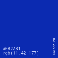 Цвет #0B2AB1 в цветовой модели RGB обозначается тремя октетами (11, 42, 177) в десятичном формате и #0B2AB1 в шестнадцатиричном (hex) формате, которые являются интенсивностью красного 11 (hex 0B), интенсивность зелёного 42 (hex 2A) и интенсивность синего 177 (hex B1).