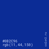 Цвет #0B2C96 в цветовой модели RGB обозначается тремя октетами (11, 44, 150) в десятичном формате и #0B2C96 в шестнадцатиричном (hex) формате, которые являются интенсивностью красного 11 (hex 0B), интенсивность зелёного 44 (hex 2C) и интенсивность синего 150 (hex 96).