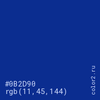 Цвет #0B2D90 в цветовой модели RGB обозначается тремя октетами (11, 45, 144) в десятичном формате и #0B2D90 в шестнадцатиричном (hex) формате, которые являются интенсивностью красного 11 (hex 0B), интенсивность зелёного 45 (hex 2D) и интенсивность синего 144 (hex 90).