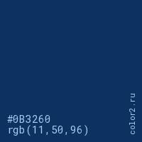 Цвет #0B3260 в цветовой модели RGB обозначается тремя октетами (11, 50, 96) в десятичном формате и #0B3260 в шестнадцатиричном (hex) формате, которые являются интенсивностью красного 11 (hex 0B), интенсивность зелёного 50 (hex 32) и интенсивность синего 96 (hex 60).