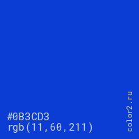 Цвет #0B3CD3 в цветовой модели RGB обозначается тремя октетами (11, 60, 211) в десятичном формате и #0B3CD3 в шестнадцатиричном (hex) формате, которые являются интенсивностью красного 11 (hex 0B), интенсивность зелёного 60 (hex 3C) и интенсивность синего 211 (hex D3).