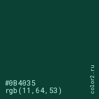 Цвет #0B4035 в цветовой модели RGB обозначается тремя октетами (11, 64, 53) в десятичном формате и #0B4035 в шестнадцатиричном (hex) формате, которые являются интенсивностью красного 11 (hex 0B), интенсивность зелёного 64 (hex 40) и интенсивность синего 53 (hex 35).