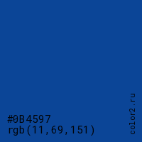 Цвет #0B4597 в цветовой модели RGB обозначается тремя октетами (11, 69, 151) в десятичном формате и #0B4597 в шестнадцатиричном (hex) формате, которые являются интенсивностью красного 11 (hex 0B), интенсивность зелёного 69 (hex 45) и интенсивность синего 151 (hex 97).