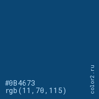 Цвет #0B4673 в цветовой модели RGB обозначается тремя октетами (11, 70, 115) в десятичном формате и #0B4673 в шестнадцатиричном (hex) формате, которые являются интенсивностью красного 11 (hex 0B), интенсивность зелёного 70 (hex 46) и интенсивность синего 115 (hex 73).