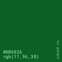 Цвет #0B6026 в цветовой модели RGB обозначается тремя октетами (11, 96, 38) в десятичном формате и #0B6026 в шестнадцатиричном (hex) формате, которые являются интенсивностью красного 11 (hex 0B), интенсивность зелёного 96 (hex 60) и интенсивность синего 38 (hex 26).