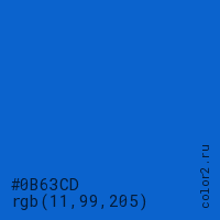 Цвет #0B63CD в цветовой модели RGB обозначается тремя октетами (11, 99, 205) в десятичном формате и #0B63CD в шестнадцатиричном (hex) формате, которые являются интенсивностью красного 11 (hex 0B), интенсивность зелёного 99 (hex 63) и интенсивность синего 205 (hex CD).