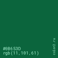 Цвет #0B653D в цветовой модели RGB обозначается тремя октетами (11, 101, 61) в десятичном формате и #0B653D в шестнадцатиричном (hex) формате, которые являются интенсивностью красного 11 (hex 0B), интенсивность зелёного 101 (hex 65) и интенсивность синего 61 (hex 3D).