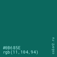 Цвет #0B685E в цветовой модели RGB обозначается тремя октетами (11, 104, 94) в десятичном формате и #0B685E в шестнадцатиричном (hex) формате, которые являются интенсивностью красного 11 (hex 0B), интенсивность зелёного 104 (hex 68) и интенсивность синего 94 (hex 5E).