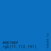 Цвет #0B70BF в цветовой модели RGB обозначается тремя октетами (11, 112, 191) в десятичном формате и #0B70BF в шестнадцатиричном (hex) формате, которые являются интенсивностью красного 11 (hex 0B), интенсивность зелёного 112 (hex 70) и интенсивность синего 191 (hex BF).