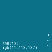 Цвет #0B7189 в цветовой модели RGB обозначается тремя октетами (11, 113, 137) в десятичном формате и #0B7189 в шестнадцатиричном (hex) формате, которые являются интенсивностью красного 11 (hex 0B), интенсивность зелёного 113 (hex 71) и интенсивность синего 137 (hex 89).