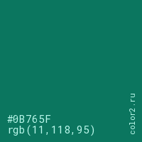 Цвет #0B765F в цветовой модели RGB обозначается тремя октетами (11, 118, 95) в десятичном формате и #0B765F в шестнадцатиричном (hex) формате, которые являются интенсивностью красного 11 (hex 0B), интенсивность зелёного 118 (hex 76) и интенсивность синего 95 (hex 5F).