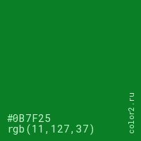 Цвет #0B7F25 в цветовой модели RGB обозначается тремя октетами (11, 127, 37) в десятичном формате и #0B7F25 в шестнадцатиричном (hex) формате, которые являются интенсивностью красного 11 (hex 0B), интенсивность зелёного 127 (hex 7F) и интенсивность синего 37 (hex 25).