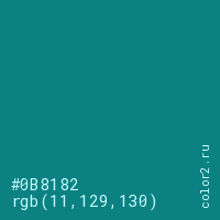 Цвет #0B8182 в цветовой модели RGB обозначается тремя октетами (11, 129, 130) в десятичном формате и #0B8182 в шестнадцатиричном (hex) формате, которые являются интенсивностью красного 11 (hex 0B), интенсивность зелёного 129 (hex 81) и интенсивность синего 130 (hex 82).