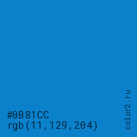 Цвет #0B81CC в цветовой модели RGB обозначается тремя октетами (11, 129, 204) в десятичном формате и #0B81CC в шестнадцатиричном (hex) формате, которые являются интенсивностью красного 11 (hex 0B), интенсивность зелёного 129 (hex 81) и интенсивность синего 204 (hex CC).