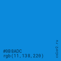 Цвет #0B8ADC в цветовой модели RGB обозначается тремя октетами (11, 138, 220) в десятичном формате и #0B8ADC в шестнадцатиричном (hex) формате, которые являются интенсивностью красного 11 (hex 0B), интенсивность зелёного 138 (hex 8A) и интенсивность синего 220 (hex DC).