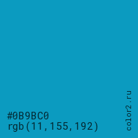 Цвет #0B9BC0 в цветовой модели RGB обозначается тремя октетами (11, 155, 192) в десятичном формате и #0B9BC0 в шестнадцатиричном (hex) формате, которые являются интенсивностью красного 11 (hex 0B), интенсивность зелёного 155 (hex 9B) и интенсивность синего 192 (hex C0).