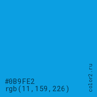 Цвет #0B9FE2 в цветовой модели RGB обозначается тремя октетами (11, 159, 226) в десятичном формате и #0B9FE2 в шестнадцатиричном (hex) формате, которые являются интенсивностью красного 11 (hex 0B), интенсивность зелёного 159 (hex 9F) и интенсивность синего 226 (hex E2).