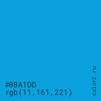 Цвет #0BA1DD в цветовой модели RGB обозначается тремя октетами (11, 161, 221) в десятичном формате и #0BA1DD в шестнадцатиричном (hex) формате, которые являются интенсивностью красного 11 (hex 0B), интенсивность зелёного 161 (hex A1) и интенсивность синего 221 (hex DD).