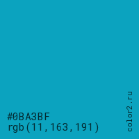 Цвет #0BA3BF в цветовой модели RGB обозначается тремя октетами (11, 163, 191) в десятичном формате и #0BA3BF в шестнадцатиричном (hex) формате, которые являются интенсивностью красного 11 (hex 0B), интенсивность зелёного 163 (hex A3) и интенсивность синего 191 (hex BF).