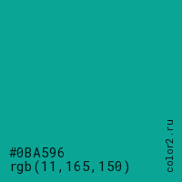 Цвет #0BA596 в цветовой модели RGB обозначается тремя октетами (11, 165, 150) в десятичном формате и #0BA596 в шестнадцатиричном (hex) формате, которые являются интенсивностью красного 11 (hex 0B), интенсивность зелёного 165 (hex A5) и интенсивность синего 150 (hex 96).