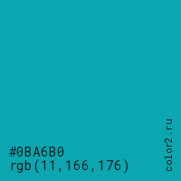 Цвет #0BA6B0 в цветовой модели RGB обозначается тремя октетами (11, 166, 176) в десятичном формате и #0BA6B0 в шестнадцатиричном (hex) формате, которые являются интенсивностью красного 11 (hex 0B), интенсивность зелёного 166 (hex A6) и интенсивность синего 176 (hex B0).