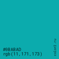 Цвет #0BABAD в цветовой модели RGB обозначается тремя октетами (11, 171, 173) в десятичном формате и #0BABAD в шестнадцатиричном (hex) формате, которые являются интенсивностью красного 11 (hex 0B), интенсивность зелёного 171 (hex AB) и интенсивность синего 173 (hex AD).