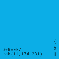 Цвет #0BAEE7 в цветовой модели RGB обозначается тремя октетами (11, 174, 231) в десятичном формате и #0BAEE7 в шестнадцатиричном (hex) формате, которые являются интенсивностью красного 11 (hex 0B), интенсивность зелёного 174 (hex AE) и интенсивность синего 231 (hex E7).