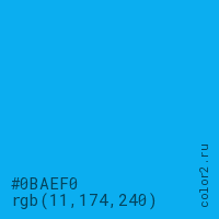 Цвет #0BAEF0 в цветовой модели RGB обозначается тремя октетами (11, 174, 240) в десятичном формате и #0BAEF0 в шестнадцатиричном (hex) формате, которые являются интенсивностью красного 11 (hex 0B), интенсивность зелёного 174 (hex AE) и интенсивность синего 240 (hex F0).