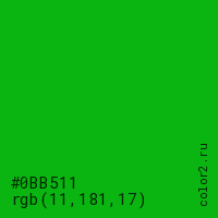 Цвет #0BB511 в цветовой модели RGB обозначается тремя октетами (11, 181, 17) в десятичном формате и #0BB511 в шестнадцатиричном (hex) формате, которые являются интенсивностью красного 11 (hex 0B), интенсивность зелёного 181 (hex B5) и интенсивность синего 17 (hex 11).