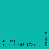 Цвет #0BB9AC в цветовой модели RGB обозначается тремя октетами (11, 185, 172) в десятичном формате и #0BB9AC в шестнадцатиричном (hex) формате, которые являются интенсивностью красного 11 (hex 0B), интенсивность зелёного 185 (hex B9) и интенсивность синего 172 (hex AC).