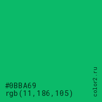 Цвет #0BBA69 в цветовой модели RGB обозначается тремя октетами (11, 186, 105) в десятичном формате и #0BBA69 в шестнадцатиричном (hex) формате, которые являются интенсивностью красного 11 (hex 0B), интенсивность зелёного 186 (hex BA) и интенсивность синего 105 (hex 69).