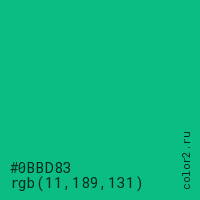 Цвет #0BBD83 в цветовой модели RGB обозначается тремя октетами (11, 189, 131) в десятичном формате и #0BBD83 в шестнадцатиричном (hex) формате, которые являются интенсивностью красного 11 (hex 0B), интенсивность зелёного 189 (hex BD) и интенсивность синего 131 (hex 83).